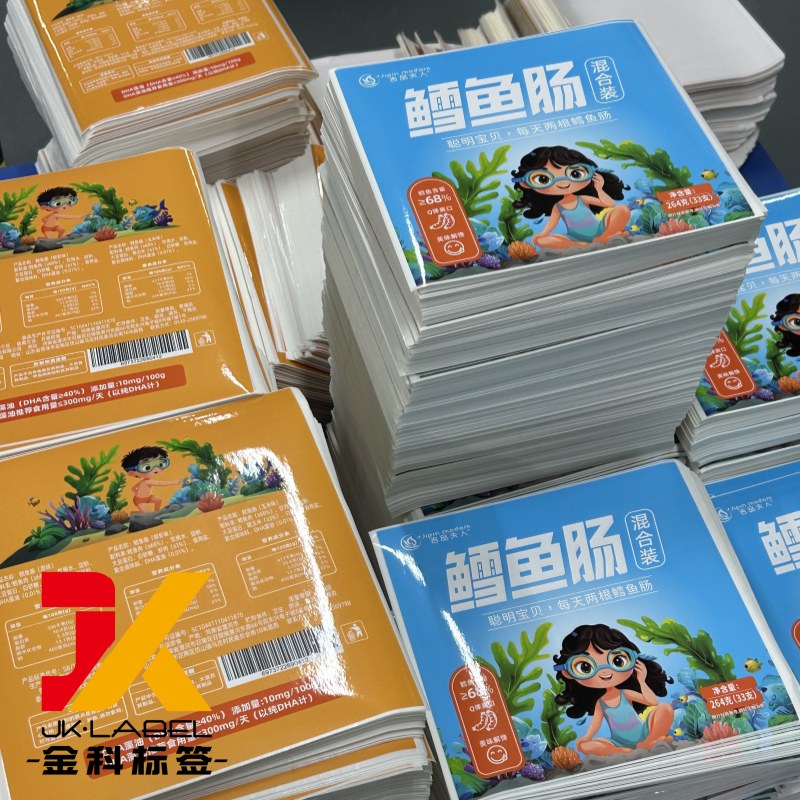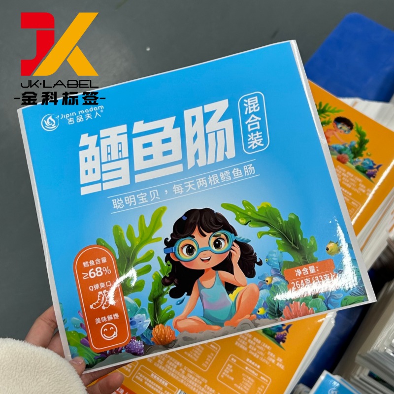 Sheet-Fed Snack Food Labels are widely used for frozen snacks, ready-to-eat foods, and retail food products that require clear presentation, stable adhesion, and high-quality printing. Based on the label shown, this product is designed for flat packaging such as frozen fish snacks, seafood-based products, and children-oriented food packaging.